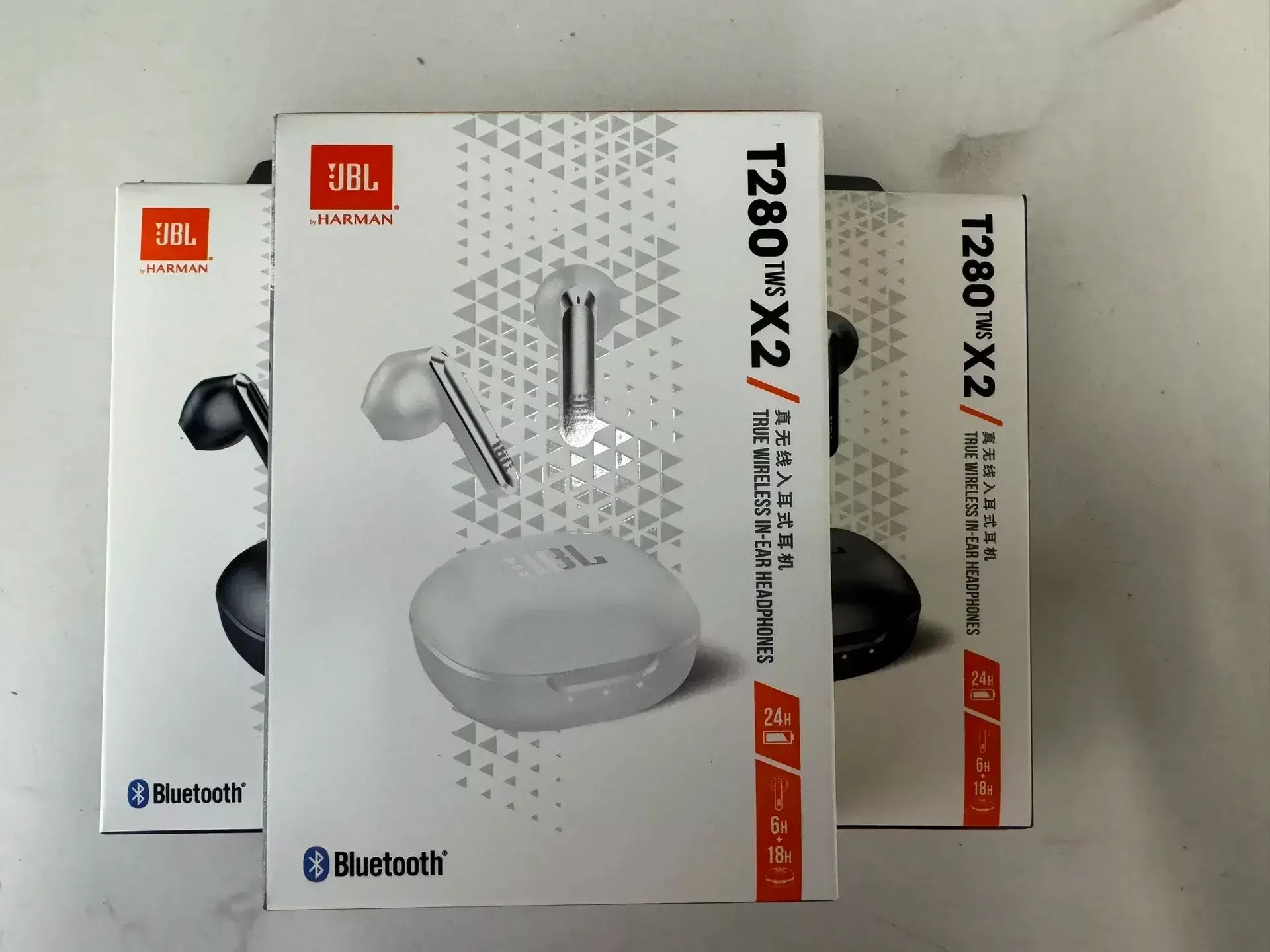• JBL T280 TWS X2 earbuds + charging case + USB-C cable + user guide